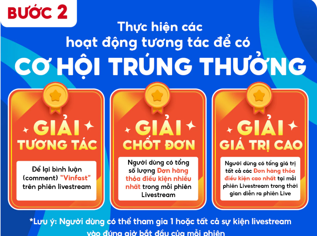 Giải chốt đơn: 01 Xe máy điện Vinfast Felix S (bản thuê pin)/1 phiên live dành cho Người dùng có số đơn hàng đạt điều kiện trúng thưởng. Tổng số lượng giải trong cả chương trình là 05 giải.