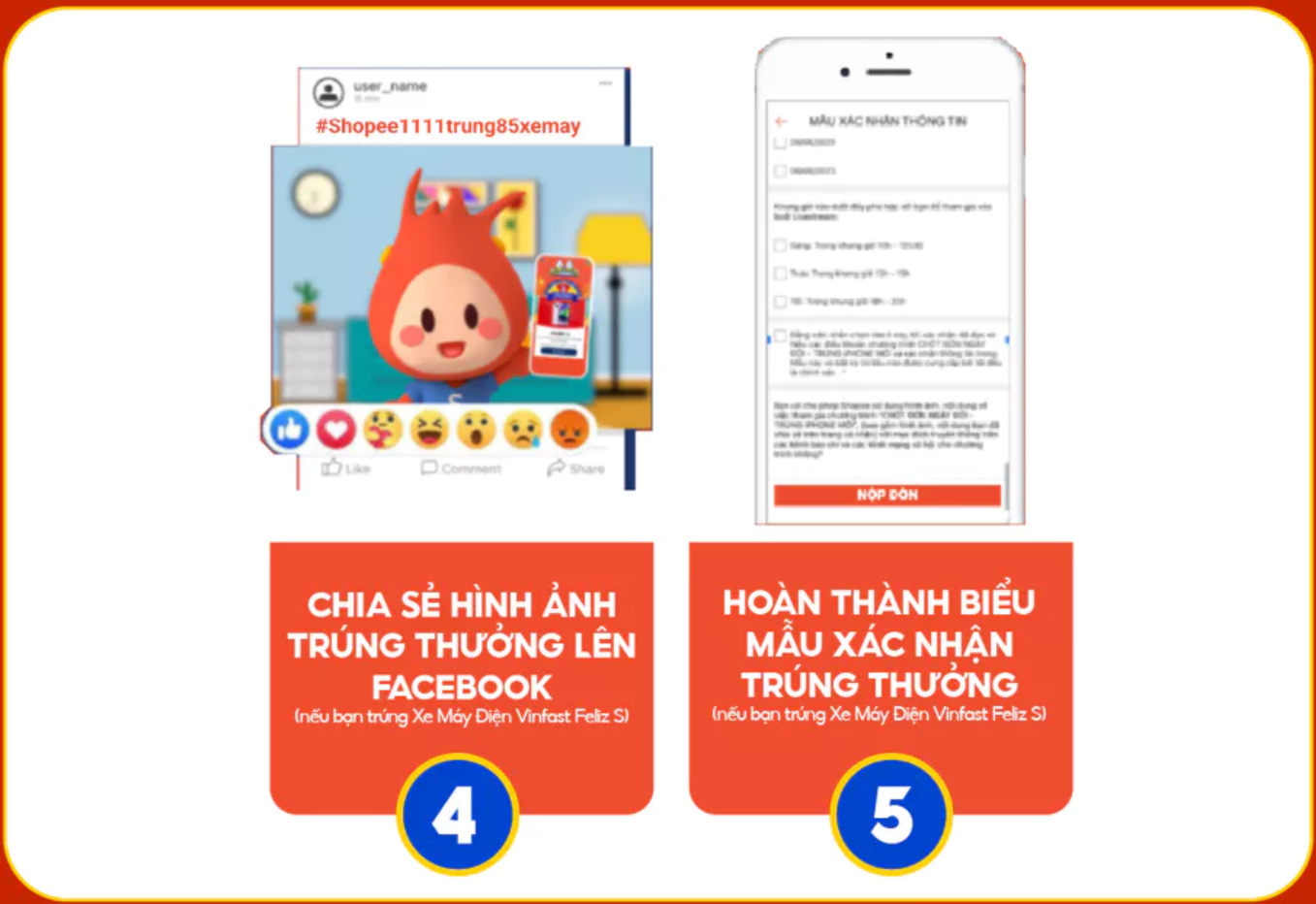 Bước 1: Chia sẻ ảnh chụp rõ mặt của Người dùng cùng thông báo trúng thưởng Xe Máy Điện Vinfast Feliz S kèm bộ hashtag #shopee1111trung85xemay lên Facebook cá nhân ở chế độ Công Khai trong vòng 12h kể từ khi nhận thông báo trúng thưởng.