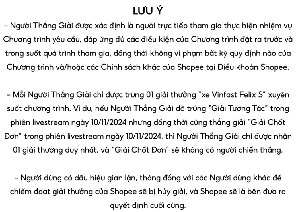 Trường hợp nếu Người dùng KHÔNG đáp ứng đầy đủ các quy định nêu trên, người đó sẽ bị loại bỏ khỏi danh sách trúng thưởng chính thức và Shopee sẽ gửi thông báo Hủy giải thưởng qua Email hoặc tại mục Thông báo > Cập nhật Shopee trước ngày 28/11/2024.