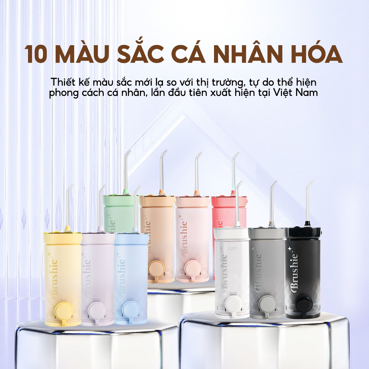 Nổi bật trong dòng tăm nước là mẫu Brushie đình đám. Sản phẩm sở hữu công nghệ siêu âm với đầu tăm cải tiến, giúp tăng bọt khí tạo cảm giác êm và dễ chịu cho nước. Máy tích hợp 3 chế độ làm sạch: