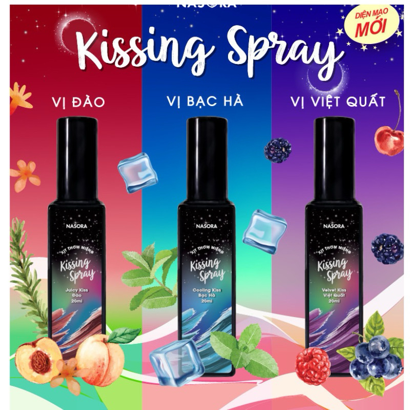Nếu nước súc miệng được khuyên sử dụng cùng viêc đánh răng sáng tối, thì xịt thơm miệng bạn có thể dùng bất cứ lúc nào, linh động và có tác dụng nhanh gọn ngay tức thì hơn. Nổi bật trong đó là dòng Kissing Spray của Nasora - 1 local brand chuyên sản xuất các dòng sản phẩm chăm sóc cơ thể có mùi hương.