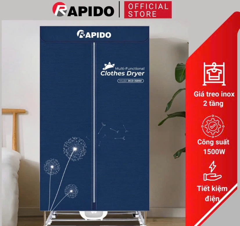 Tủ sấy quần áo Rapido là dòng tủ sấy 2 tầng có khả năng chịu tải đến 15kg phù hợp sấy lượng lớn quần áo trong 1 lần. Chỉ với 600k, em này có các ưu điểm nổi bật như:
