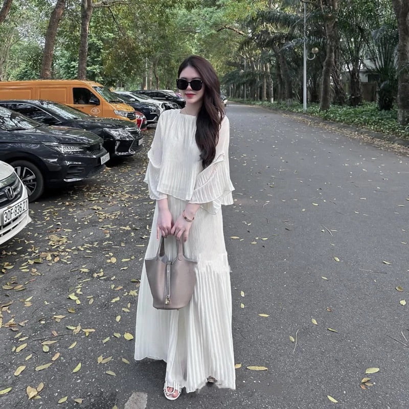 Một set đồ du lịch đầu năm mang phong cách "nàng thơ" chính là bộ áo tơ dập ly trễ vai kết hợp cùng chân váy mềm mại. Thiết kế trễ vai giúp nàng khoe khéo bờ vai thon, trong khi chất liệu tơ dập ly mang đến vẻ đẹp nhẹ nhàng, bay bổng. Đây là set đồ cực kỳ phù hợp cho những chuyến đi đến Đà Lạt, Hội An hay bất kỳ điểm đến lãng mạn nào trong dịp đầu năm.