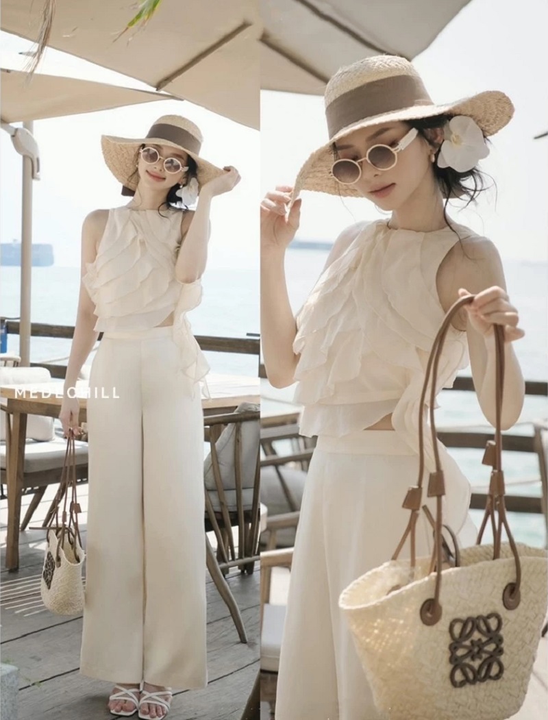 Nếu nàng muốn một set đồ du lịch đầu năm vừa thanh lịch vừa quyến rũ, thì combo áo croptop sát nách phối bèo cùng quần suông chính là lựa chọn hoàn hảo. Áo croptop giúp khoe trọn vòng eo thon gọn, trong khi quần suông tôn dáng và tạo sự thanh thoát. Đây là outfit cực kỳ phù hợp để diện trong những buổi dạo chơi đầu năm hay những bữa tiệc nhẹ nhàng ngoài trời.