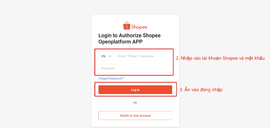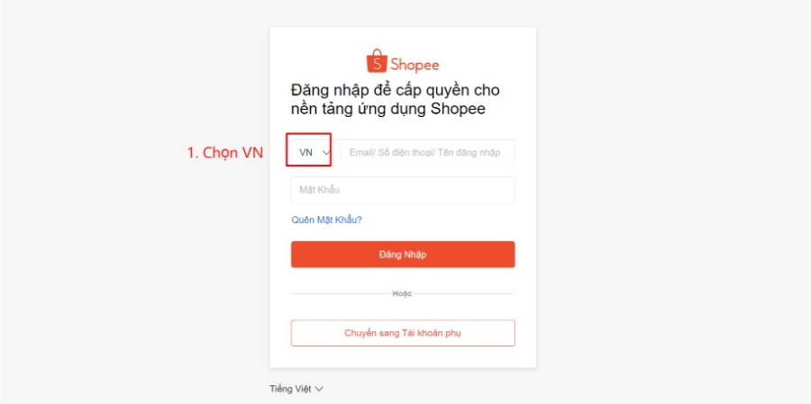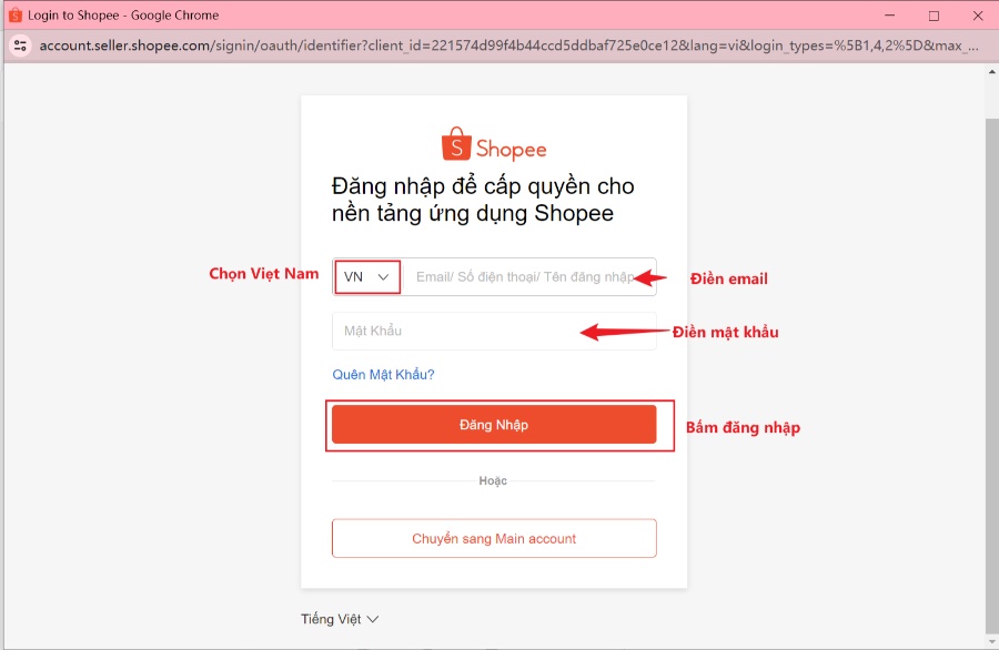 Bước 3: Chọn khu vực Việt Nam, sau đó nhập tài khoản và mật khẩu Shopee → bấm Đăng nhập để xác nhận quyền kết nối.