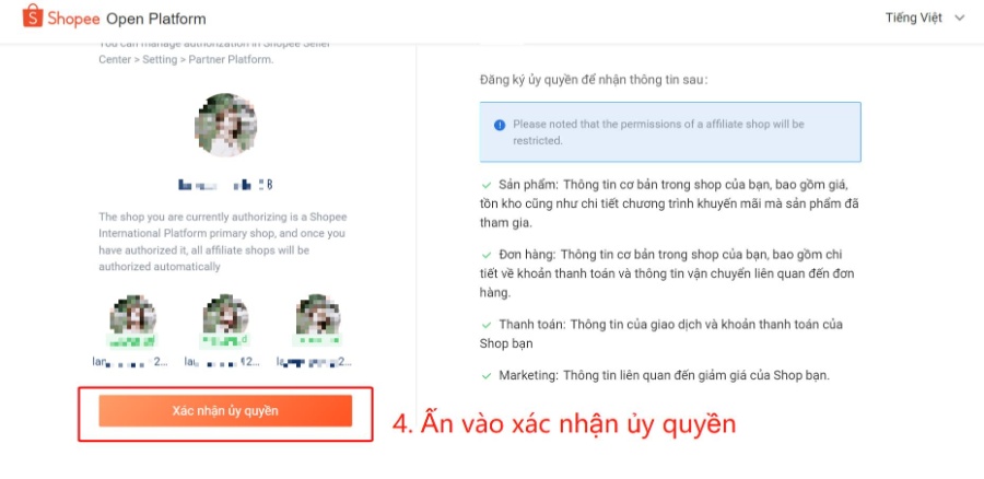 Nếu không chắc chắn, bạn có thể kiểm tra tại mục Cấp quyền tài khoản → Kết nối gian hàng để tra cứu thông tin trước khi hoàn tất xác nhận.
