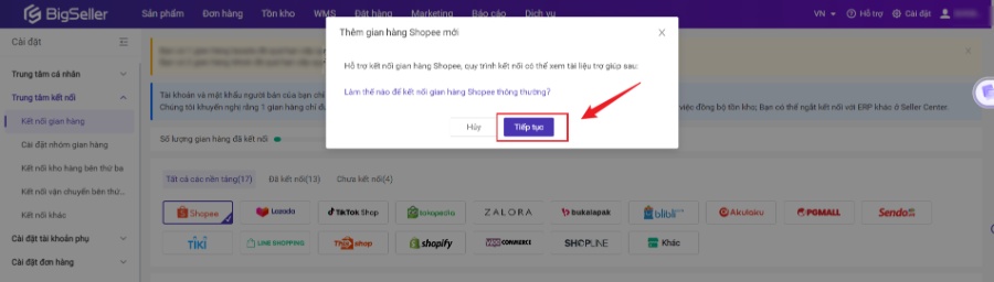 Bước 2: Vào mục Cài đặt → Kết nối gian hàng, chọn biểu tượng Shopee, sau đó nhấn “+ Thêm gian hàng” → bấm Tiếp tục để chuyển đến giao diện kết nối.