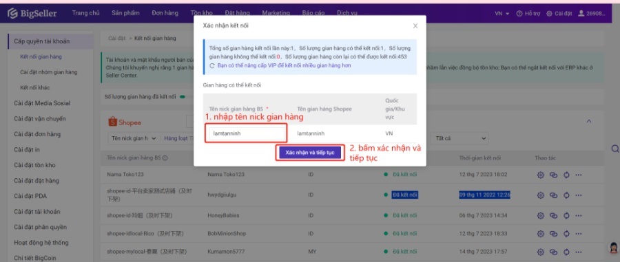 Lưu ý: Tên gian hàng nhập vào phải là tên chưa từng sử dụng trước đó trên tài khoản BigSeller.