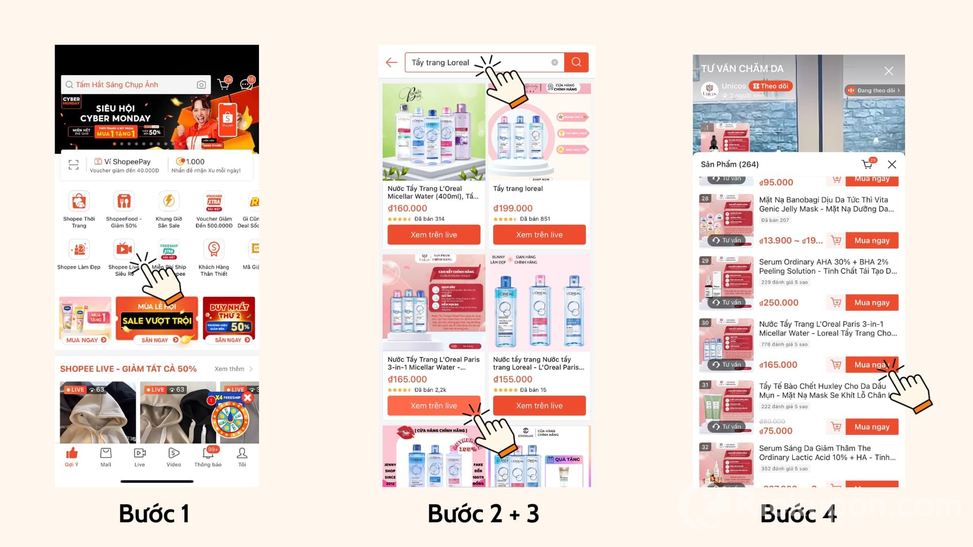 - Bước 2: Gõ tên sản phẩm bạn muốn mua. Ví dụ như “Nước tẩy trang L’Oreal” sau đó nhấn “Tìm kiếm”