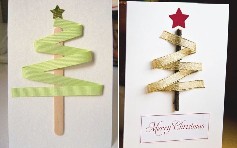 - Bước 2: Dùng que gỗ và dính nó vào chính giữa thiệp. Sử dụng bút màu, ruy băng, hoặc thậm chí là nút áo cùng keo dán để tạo hình cho cây thông Noel. Bạn cũng có thể thêm một chiếc ngôi sao ở đỉnh cây và viết lời chúc mừng theo sở thích cá nhân.