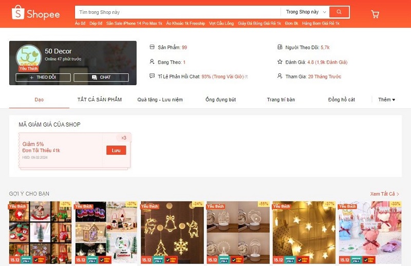 50 Decor là một cửa hàng chuyên cung cấp sản phẩm trang trí nội thất và đồ dùng gia đình trên Shopee. Cửa hàng này cung cấp một loạt các sản phẩm trang trí, bao gồm cả đồ trang trí cho mùa lễ hội như thiệp Giáng Sinh. Với sự sáng tạo và chất lượng, 50 Decor giúp bạn tạo nên không gian ấm cúng và phong cách cho mùa lễ quan trọng này.