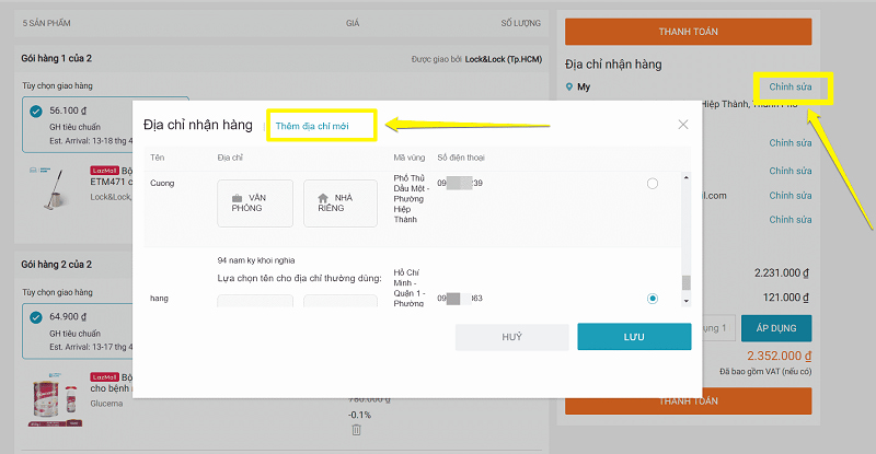 - Bước 2: Sau đó, bạn chọn thêm địa chỉ hoặc chỉnh sửa địa chỉ nhận hàng mà bạn đã lưu.