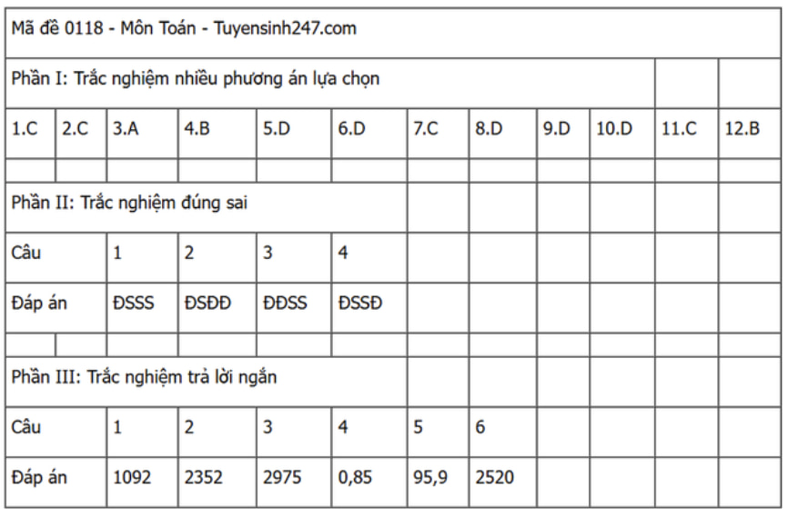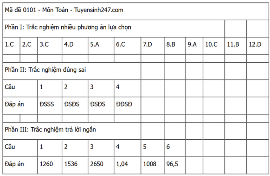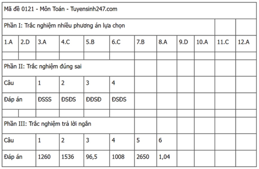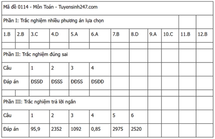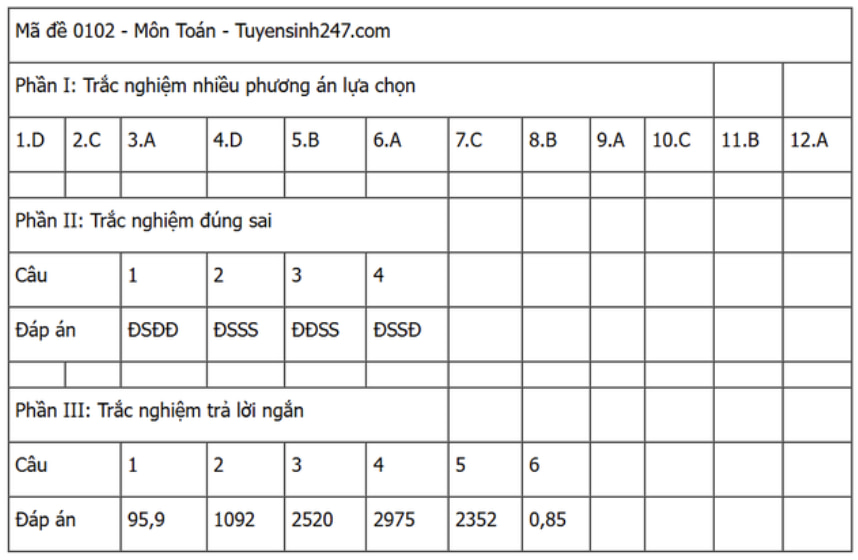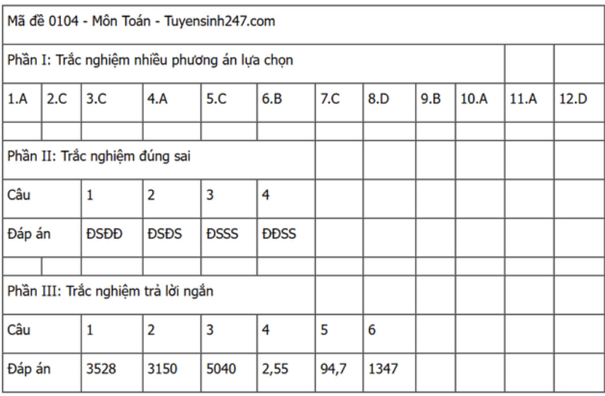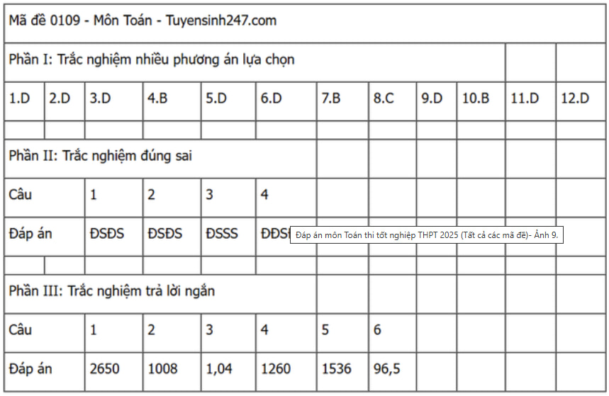 Đáp án đề thi môn Toán THPT Quốc gia năm 2025 tất cả các mã đề