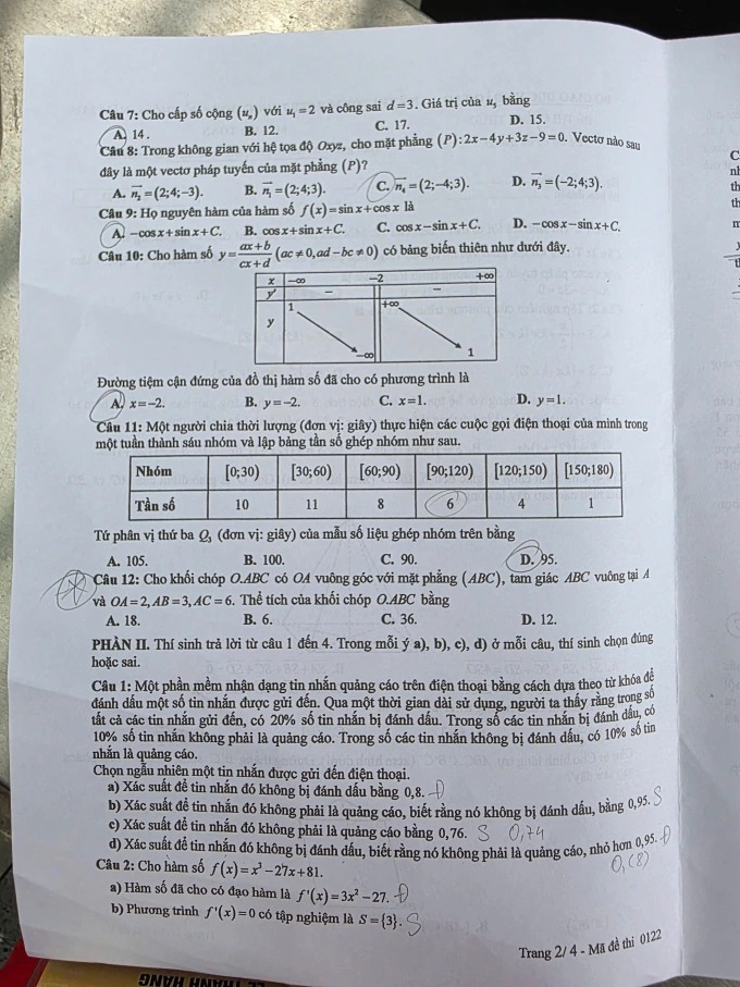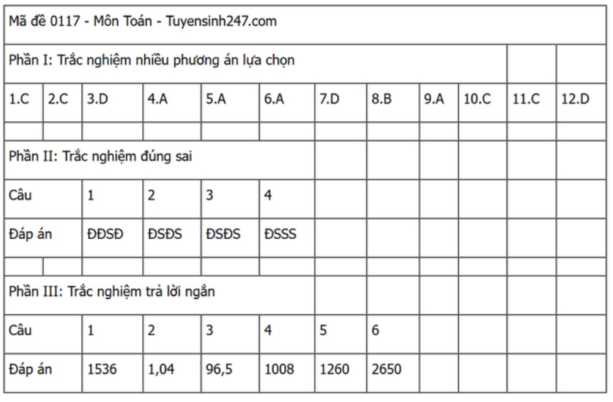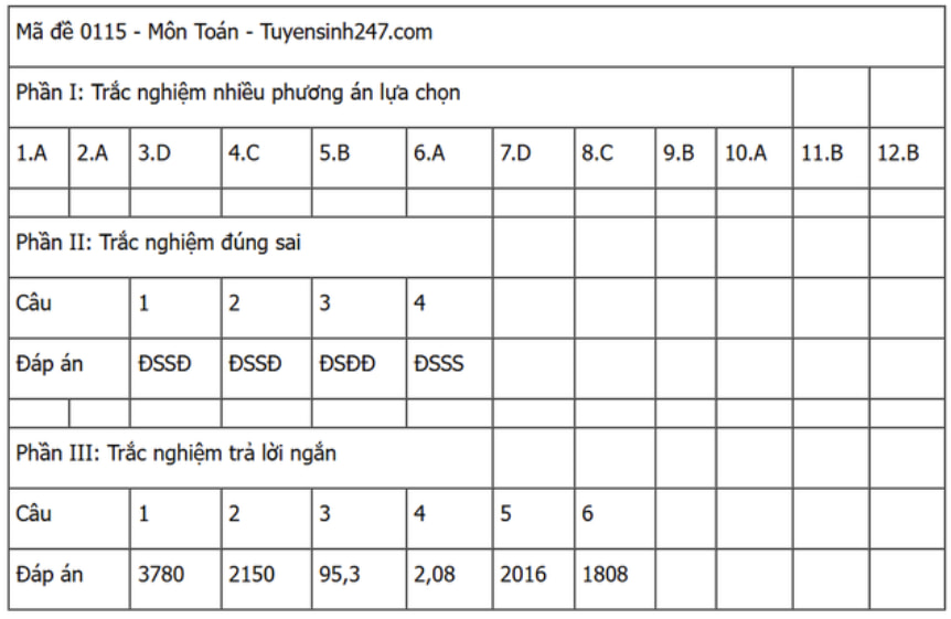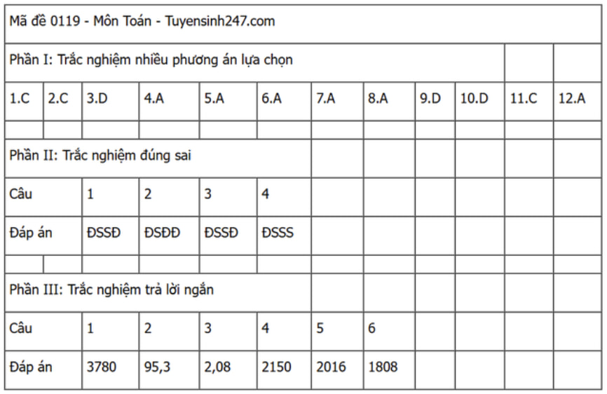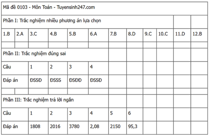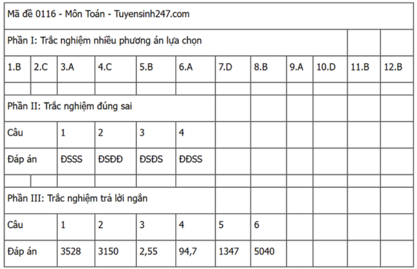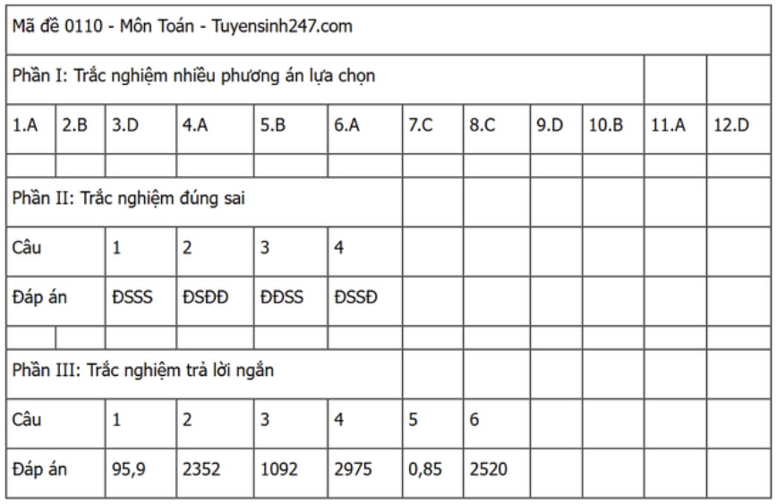 Đáp án đề thi môn Toán THPT Quốc gia năm 2025 tất cả các mã đề