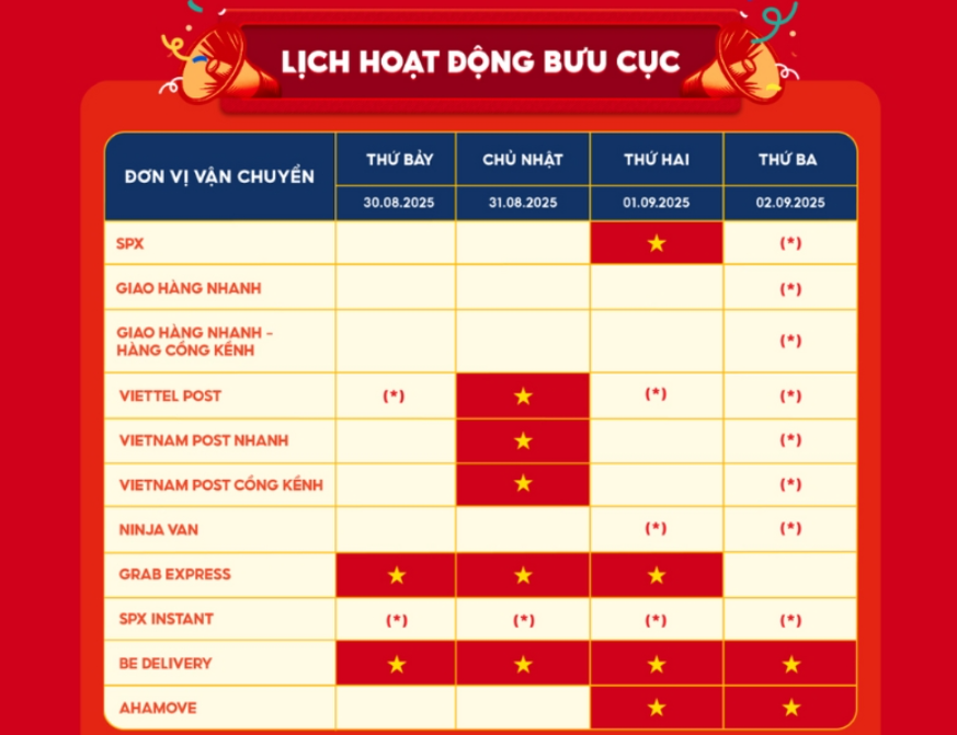 Lịch làm việc của các đơn vị vận chuyển Shopee lễ 2/9