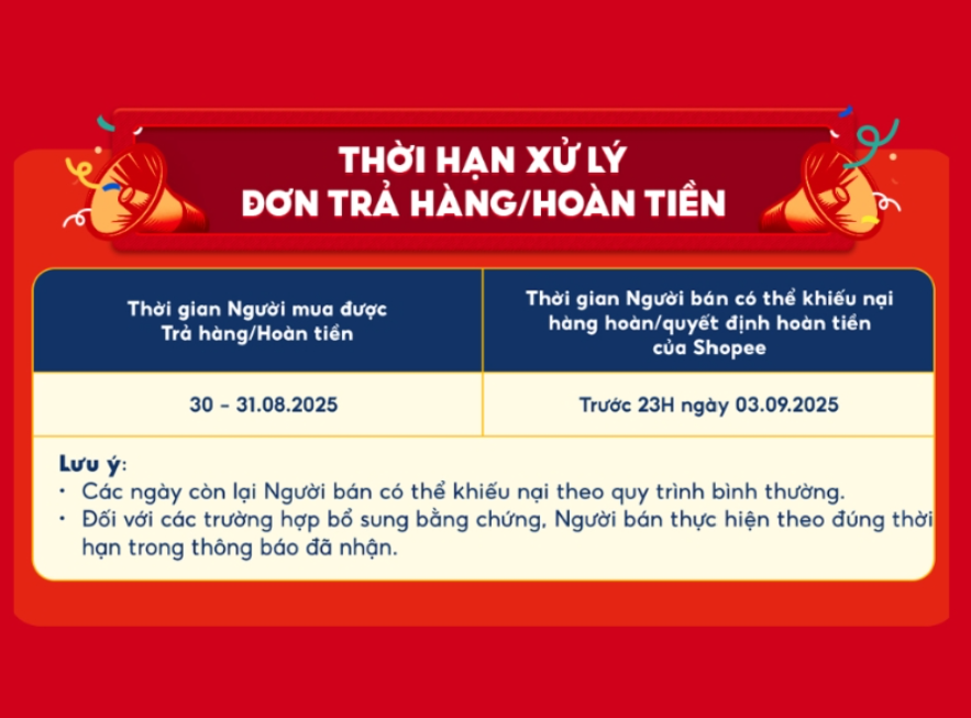 Thời hạn xử lý các đơn Trả hàng/Hoàn Tiền vào ngày 2/9