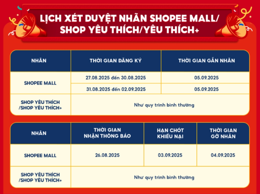 Lịch xét duyệt nhãn Shopee Mall/Shop Yêu thích/Yêu thích+