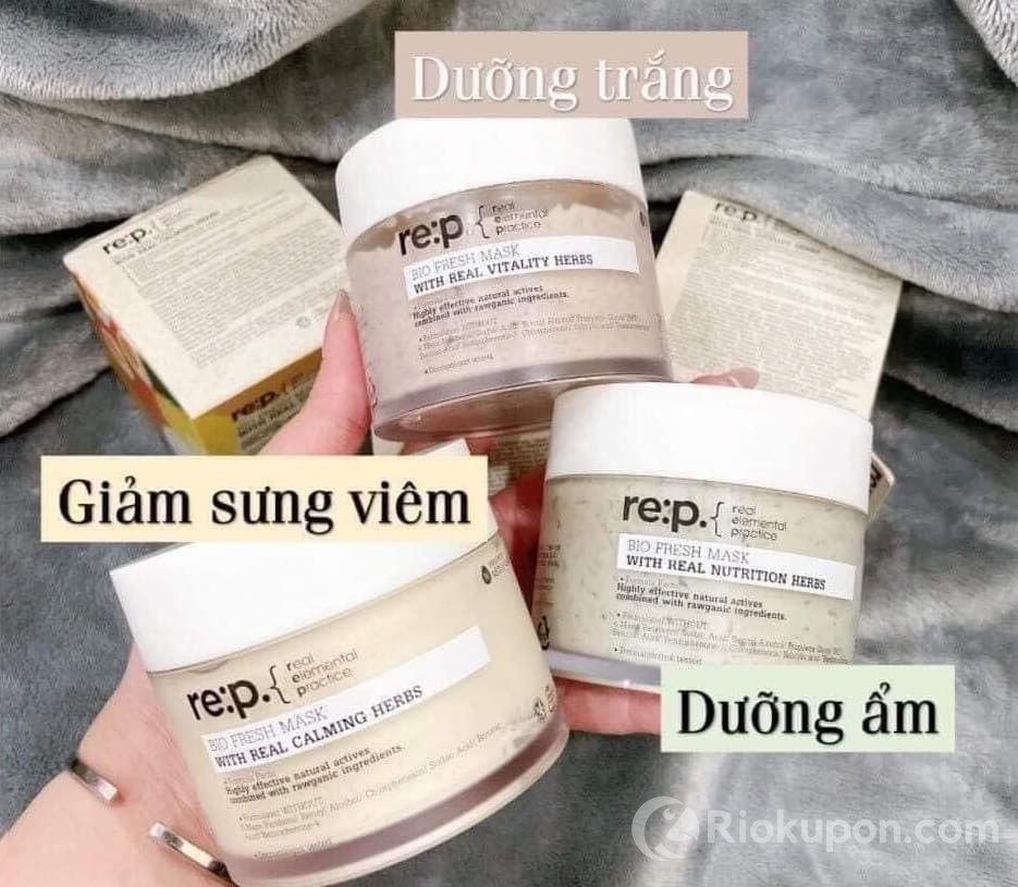 - Mặt nạ đất sét RE:P Bio Fresh Mask With Real Calming Herbs: hộp màu nâu chiết xuất hoa cúc. Có tác dụng tăng cường khả năng làm dịu da, phục hồi tổn thương, giảm đỏ rát, kích ứng da. Dòng mặt nạ này thì thích hợp với mọi loại da.