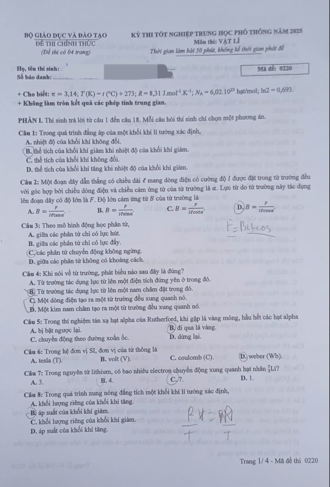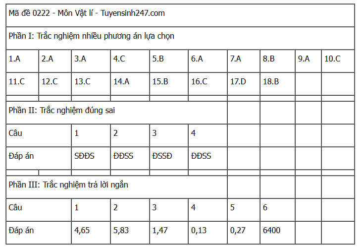 Đáp án đề thi Vật Lý tốt nghiệp THPT năm 2025