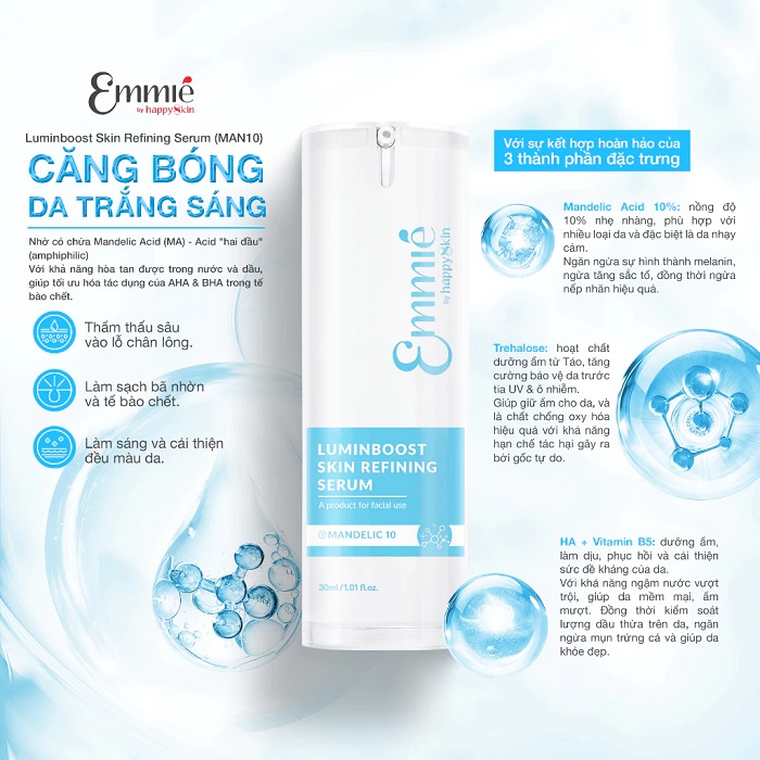 - Tinh chất trẻ hóa căng bóng da Emmié by Happyskin Luminboost Skin Refining Serum 10% Mandelic 30ml