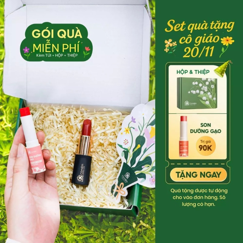 Nếu cô giáo của bạn yêu thích sự nhẹ nhàng và tự nhiên, combo son môi Cỏ Mềm chắn chắn là món quà phù hợp. Đây là một gợi ý tuyệt đẹp để lựa chọn set quà 20/11 tặng cô giáo, vì son có bảng màu thanh lịch, chất son mềm mướt và thành phần an toàn. Hộp quà xinh xắn mang đến cảm giác tinh tế, phù hợp với mọi phong cách của giáo viên nữ.