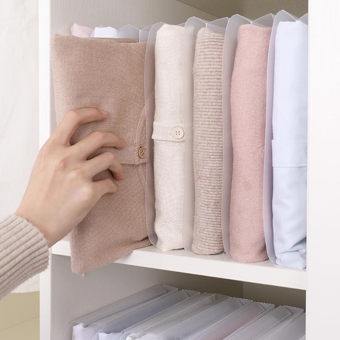 Việc gấp quần áo len một cách gọn gàng không chỉ giúp tăng tính ngăn nắp trong tủ quần áo mà còn giảm nguy cơ nhăn và gấp lớp len. Khi gấp, hãy đảm bảo rằng bạn sử dụng kỹ thuật gấp đúng, tuân thủ theo hướng dẫn từ nhãn mác hoặc theo hình dáng và kích thước mong muốn để giúp duy trì hình dạng và vẻ ngoài đẹp mắt của quần áo len. Bạn có thể sử dụng dụng cụ gấp quần áo để hỗ trợ việc gấp đồ.