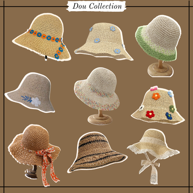 Nếu thích phá cách, trẻ trung và có nhiều điểm nhấn hơn với mẫu mũ mình mang bạn có thể chọn mũ cói có thêu họa tiết nhà Dou Collection. Các mẫu mũ ở đây có đặc tính là mềm có độ rủ nhẹ, không quá đứng form. Điểm nhấn nằm ở các hoạt tiết thêu hoa, lá nhiều màu sắc ở thân mũ đúng vibe đi biển. Có mẫu sẽ có quai nơ hoặc không tùy gu bạn chọn.