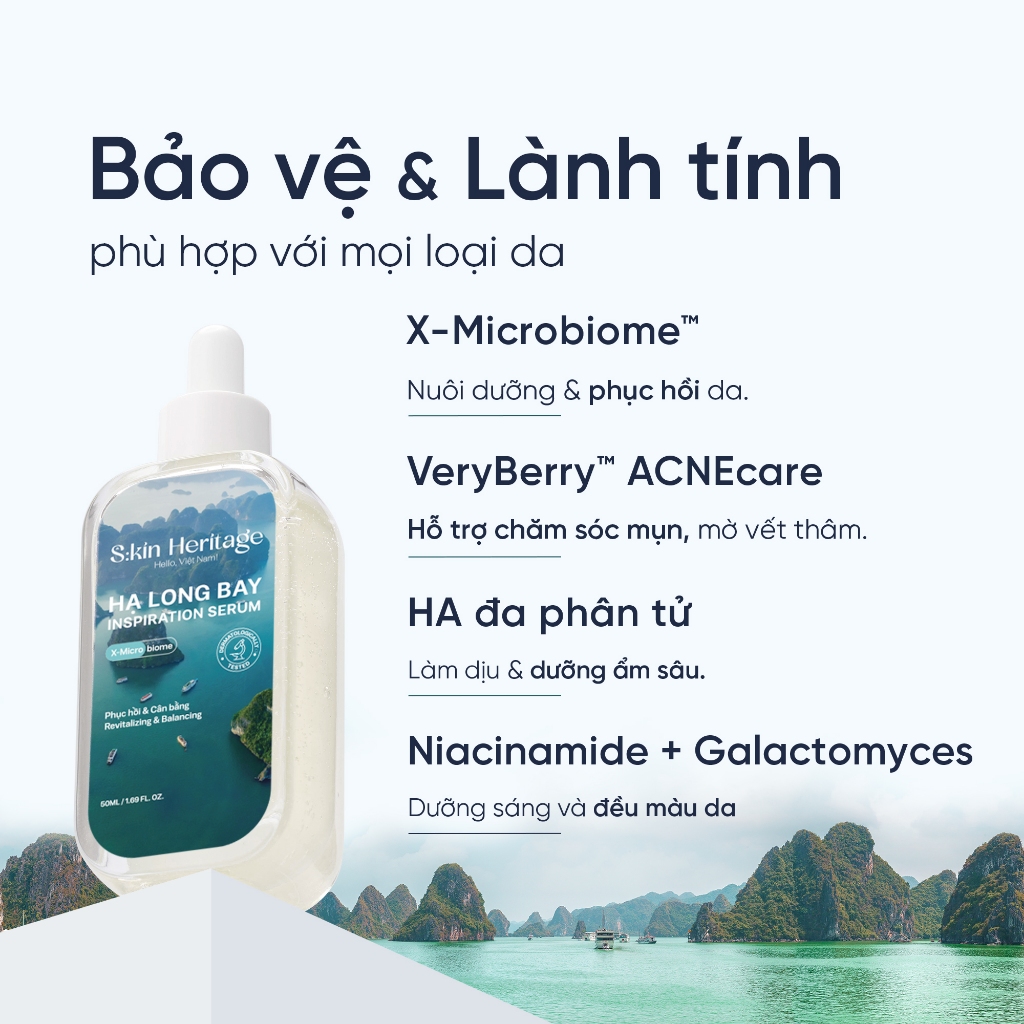 Vịnh Hạ Long không chỉ mang vẻ đẹp của những dãy núi, hệ thống hang động khổng lồ dưới làn nước xanh mà còn gây ấn tượng bởi hệ sinh thái động-thực vật đa dạng từ thiên nhiên. Cảm mến trước vẻ đẹp đó, tinh chất Hạ Long ra đời, với thành phần chứa tới 60 lợi khuẩn cùng chiết xuất ngải cứu giúp hỗ trợ phục hồi và làm dịu da, bảo vệ da trước những tác nhân gây mụn, lão hóa, duy trì lượng vi sinh vật có lợi trên da. Đồng thời còn giúp dưỡng ẩm, giảm mụn, làm se và khô cồi mụn nhanh chóng, cực kỳ thích hợp với làn da mụn khó chiều.