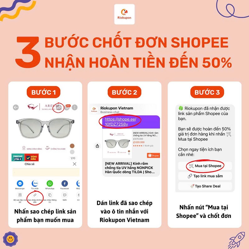 Với Riokupon, bạn có thể dễ dàng nhận lại một phần tiền từ các giao dịch mua sắm của mình, giúp bạn tiết kiệm hơn và làm cho mỗi lần mua sắm trở nên đáng giá hơn. Để mang lại lợi ích tối ưu cho bạn trong việc mua sắm trực tuyến, hãy cùng khám phá cách để mua sắm trên Shopee hoàn tiền qua Riokupon thông qua các bước hướng dẫn trong ảnh bên dưới: