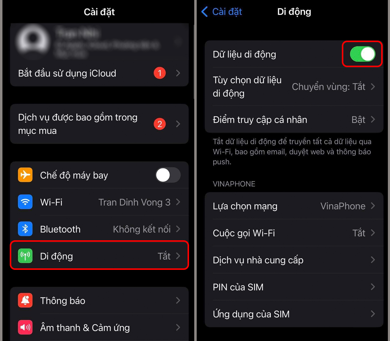 - Bước 1: Mở điện thoại iPhone > Chọn mục “Cài đặt” (Settings) > Nhấn chọn vào mục “Di động” (Mobile service) > Chọn “Dữ liệu di động” (Mobile data option).