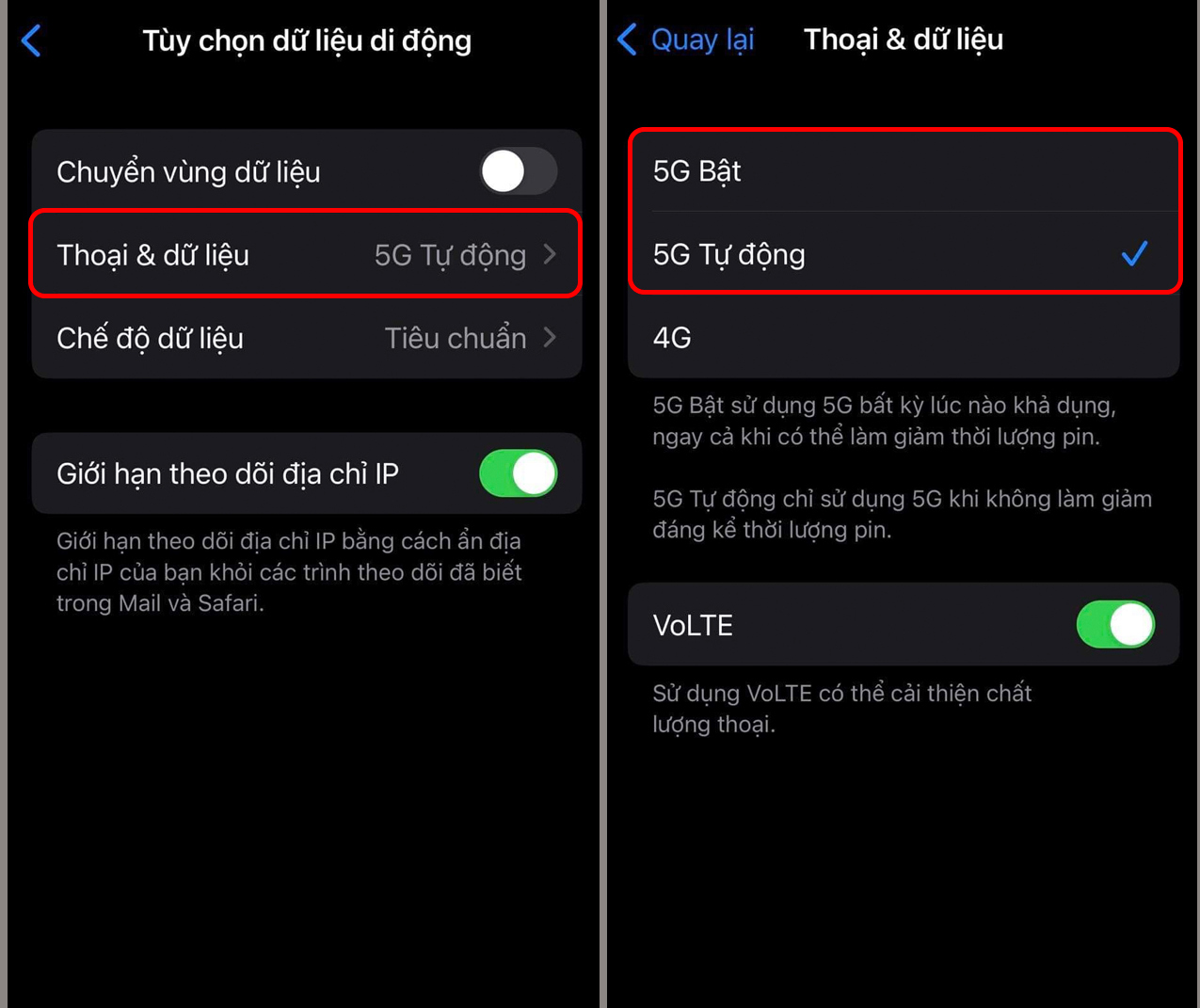 - Bước 2: Chọn tiếp mục “Thoại và dữ liệu” (Voice & Data) > Chọn “5G tự động” (5G Auto) hoặc 5G Bật.