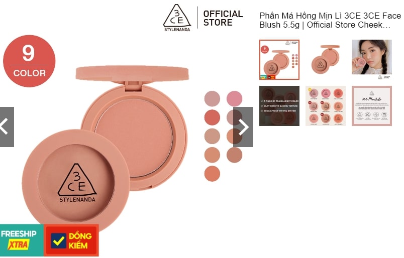 Dòng phấn mắt Face Blush của 3CE có trọng lượng nhẹ chỉ 5.5g để các nàng dễ dang mang theo bên mình. Sản phẩm có 9 màu tùy chọn, đó là: Nude peach (đào sữa), Mono pink (hồng đất pha chút ánh cam), Rose beige (cam hồng đất), Soft salmon (cam sữa), Peach splash (cam nude), Puke care (hồng nude), Delectable (hồng anh đào), City Mauve (hồng pastel), Full Off Charm (cam hồng sữa).