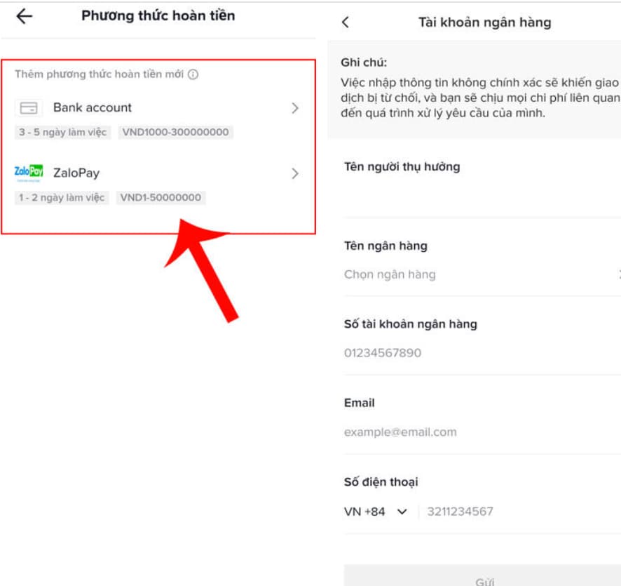 - Chọn mục Quản lý các phương thức thanh toán => Phương thức hoàn tiền => Chọn hoàn tiền qua Bank Account hoặc Ví ZaloPay => Điền thông tin tài khoản ngân hàng và ấn nút Gửi là xong.