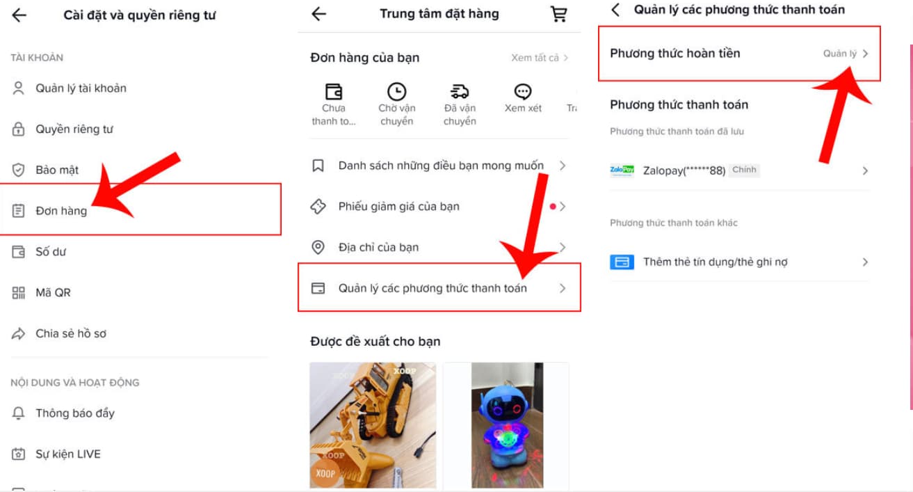 Bước 6: Ấn vào chọn mục Phương thức hoàn tiền.