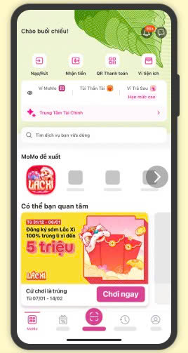 Bước 1: Tại màn hình chính của Ứng Dụng MoMo, chọn biểu tượng Lắc Xì hoặc nhấn nút “Chơi ngay” trên các hình ảnh của chương trình.