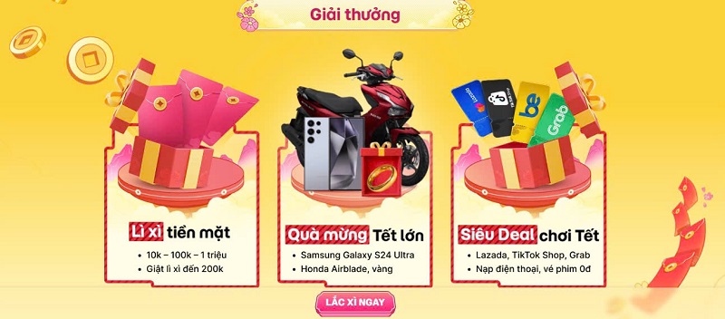 - Mảnh ghép may mắn: Thu thập mảnh ghép và có cơ hội nhận các hiện vật giá trị cao như xe máy Air Blade, điện thoại Samsung, vàng, voucher, cùng bao lì xì tiền mặt giá trị lớn.