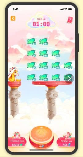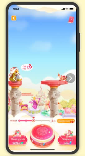 Bước 1: Sau khi hoàn thành 4 chặng đầu tiên, bạn sẽ bước vào chế độ chơi Vô Cực. Nhấn và giữ nút chơi để điều chỉnh độ dài của cây tre sao cho chạm vào mây ngũ sắc. Khi chạm vào mây, bạn sẽ được đưa vào màn chơi “Bí mật trên mây”, nơi có cơ hội săn thêm nhiều Lá Lộc quý giá.