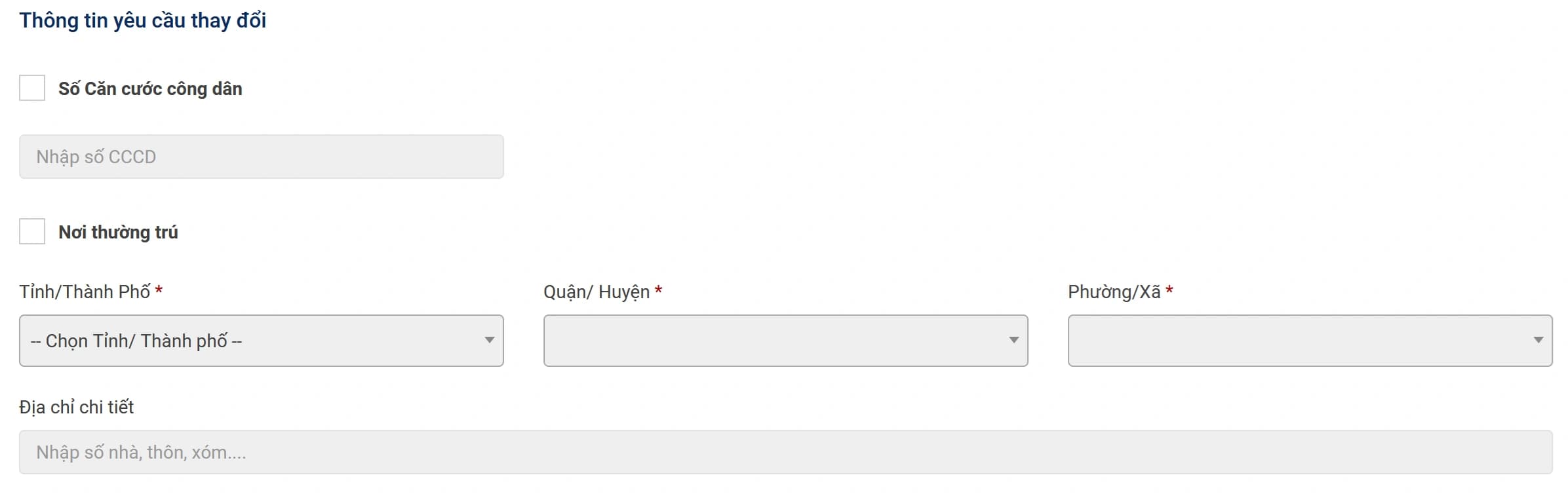Mục "Thông tin yêu cầu thay đổi", bạn có thể chọn để cập nhật số căn cước công dân (trong trường hợp giấy phép lái xe vẫn sử dụng số chứng minh cũ) hoặc cập nhật lại địa chỉ nhà nếu có thay đổi. Nếu không cần thay đổi thông tin, bạn có thể bỏ qua bước này.