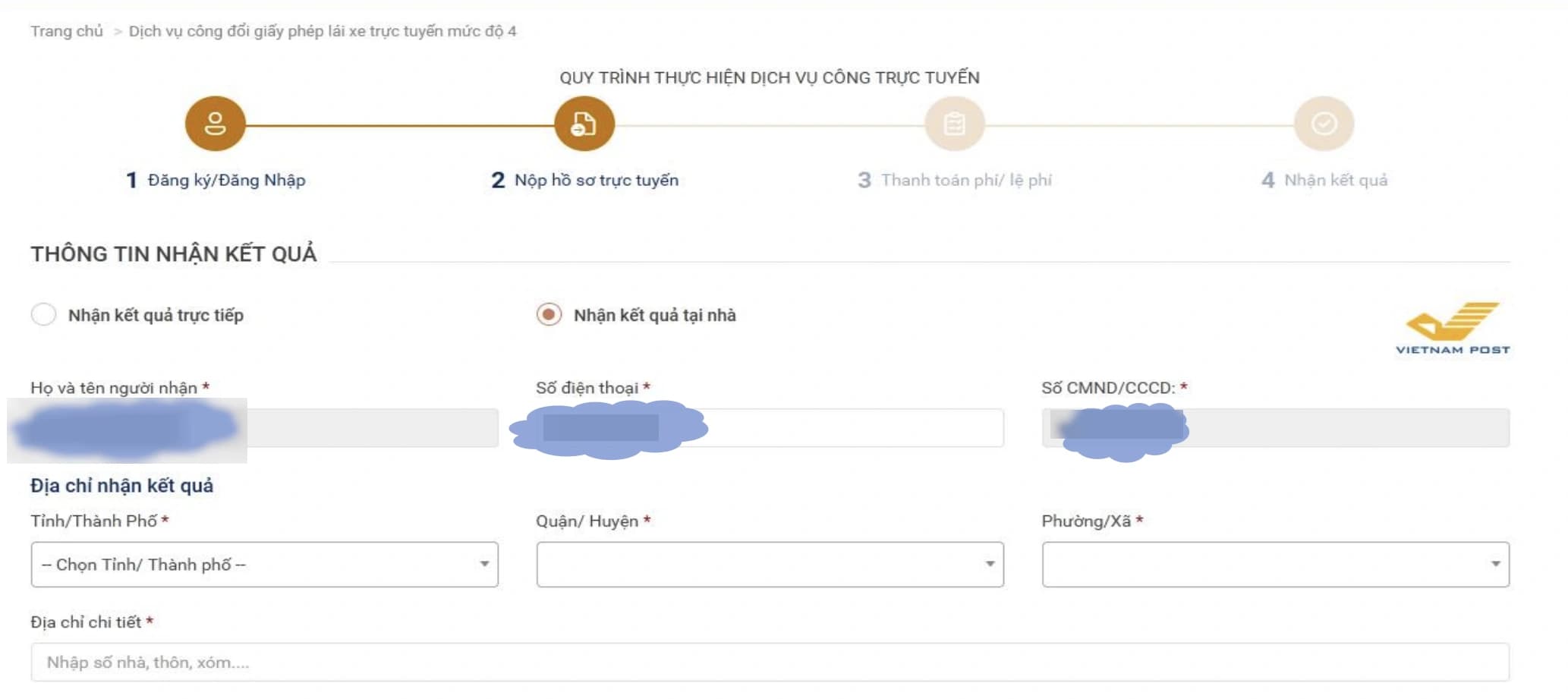 Cuối cùng, bạn chọn "Nhận kết quả tại nhà" và điền đầy đủ thông tin người nhận để bưu điện gửi GPLX mới về tận địa chỉ đã khai báo.