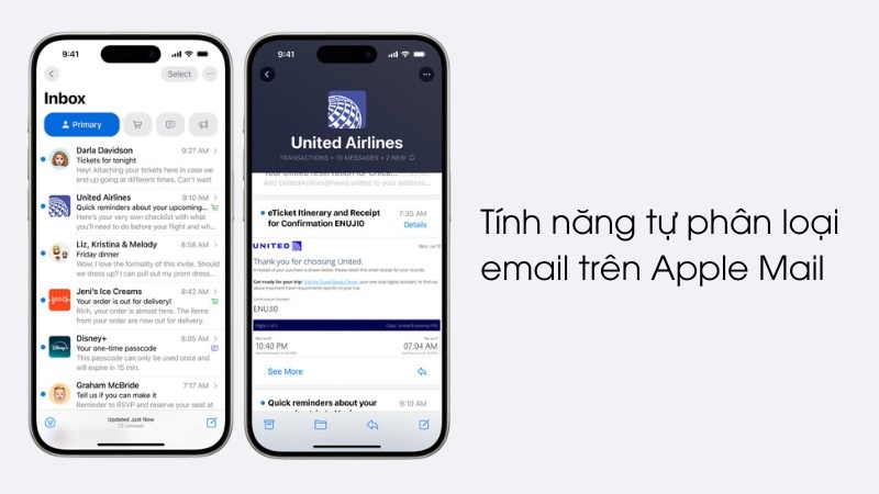 Ứng dụng Apple Mail trong phiên bản này đã được nâng cấp khá nhiều giúp người dùng quản lý hộp thư thuận tiện hơn nhờ tính năng phân loại email thông minh mà không cần dùng đến mạng internet. Ứng dụng này sẽ tự động phân loại email vào các danh mục như thư quảng cáo, thư quan trọng, thư rác, thư từ mạng xã hội,...giúp bạn tiết kiệm thời gian lọc hơn nhiều.