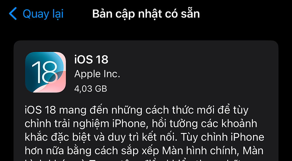 Đây cũng là một trong những đợt cập nhật lớn nhất của iOS trong những năm gần đây, với dung lượng lên tới 4GB trên iPhone 15 Pro Max. Lần update này, Apple đã đưa ra gần 20 thay đổi lớn với thiết bị của mình, và chủ yếu tập trung vào khả năng cá nhân hóa giao diện.
