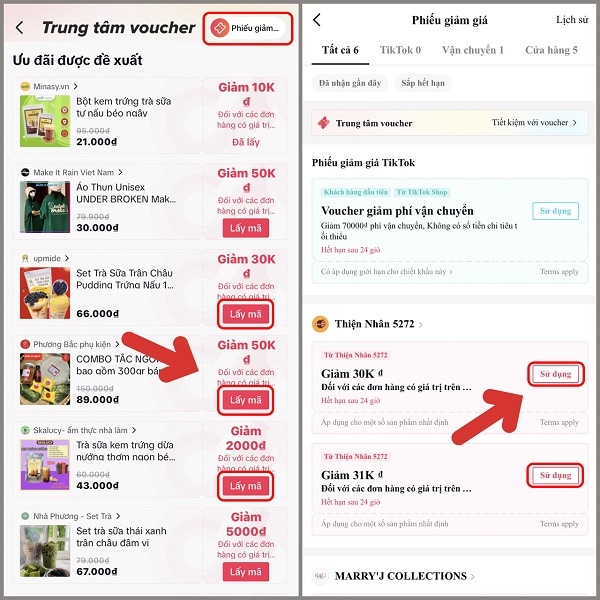 - Lấy mã giảm giá từ mục "Phiếu giảm giá" trên ứng dụng TikTok của bạn.