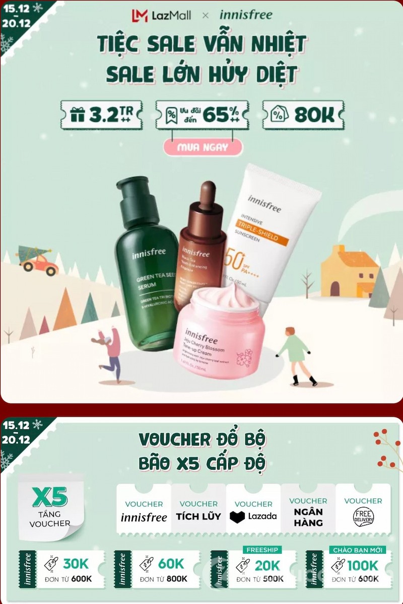 Đây là một thương hiệu mỹ phẩm không còn quá xa lạ với chị em phụ nữ yêu thích làm đẹp. Và dịp sale giữa tháng 15.12 này, Innisfree cũng tung ra rất nhiều chương trình khuyến mãi lớn và siêu deal cực hot.