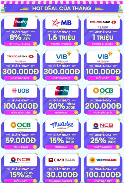 - Giảm 1 triệu cho iPhone 17 Series khi thanh toán qua thẻ ghi nợ Techcombank tại Apple Flagship Store (19.09 - 31.12.2025).