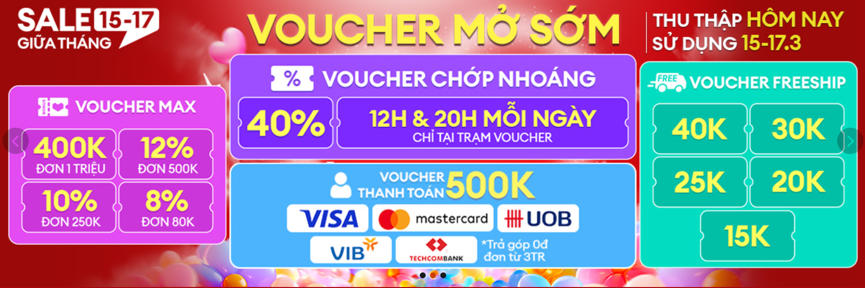 Đặc biệt lần này sàn còn có hàng loạt các voucher thương hiệu mở mỗi ngày từ 0H 15.3 đến 23H59' ngày 17.3. Cụ thể: