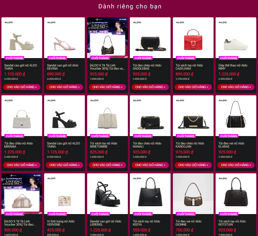 Yêu thích các sản phẩm phụ kiện thời trang như giày dép hay túi xách thì Aldo sẽ là local brand mà bạn không nên bỏ qua trong event lần này. Thương hiệu đem tới ưu đãi sâu chưa từng thấy cho bạn gồm:
