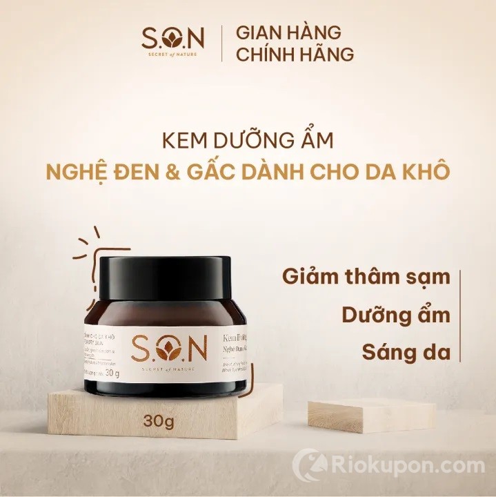 Kem dưỡng ẩm S.O.N có chiết xuất thiên nhiên 100% từ chiết xuất nghệ đen giàu hàm lượng Curcuminoid và chiết xuất gấc giàu Lycopene. Kem dưỡng có 3 công dụng chính đối với làn da là cấp ẩm sâu, giảm thâm sạm và làm sáng da. S.O.N cho bạn trải nghiệm sản phẩm Việt tốt nhất, mùi hương tươi mát, nhẹ nhàng.