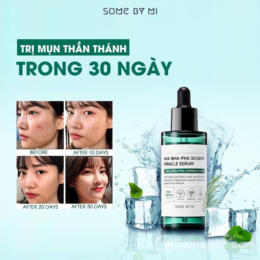 Serum trị mụn Some By Mi thích hợp với các trường hợp da đang bị mụn viêm, mụn trứng cá, mụn ẩn, mụn đầu đen. Với bảng thành phần chiết xuất rau má, tràm trà, AHA - BHA - PHA giúp kháng viêm, giảm mụn. Bên cạnh đó còn có tác dụng làm dịu da, tạo lớp bảo vệ da khỏi những tác hại xấu ở môi trường bên ngoài cũng như hỗ trợ tái tạo làn da. Serum còn giúp tẩy tế bào chết nhẹ nhàng, ngăn chặn tình trạng tắc nghẽn lỗ chân lông, loại bỏ mụn ẩn nhanh chóng.