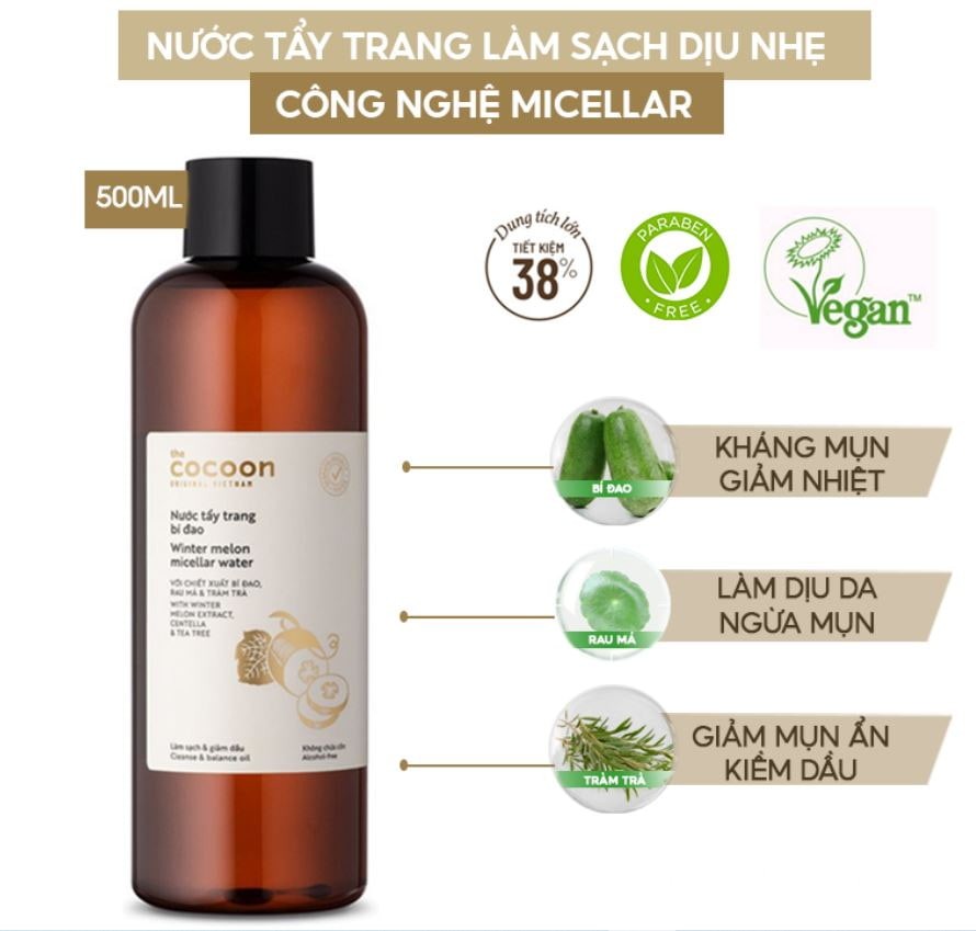 Nước Tẩy Trang Bí Đao Cocoon là sản phẩm có chứa chất làm sạch đặc biệt Natragem S150 kết hợp với công nghệ Micellar tiên tiến, có khả năng làm sạch hoàn toàn bụi bẩn trên da và các lớp trang điểm như: kem nền, phấn phủ, mascara, eyeliner,... cùng với dầu thừa và toàn bộ bụi bẩn từ sâu bên trong. Đồng thời, Nước Tẩy Trang Bí Đao Cocoon còn được đánh giá cao bởi khả năng không gây cay mắt và an toàn cho mọi đối tượng.