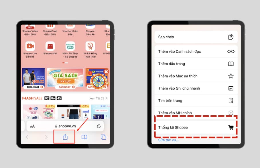 - Bước 2: Chọn nút chia sẻ ở góc dưới màn hình sẽ thấy “Thống kê Shopee”